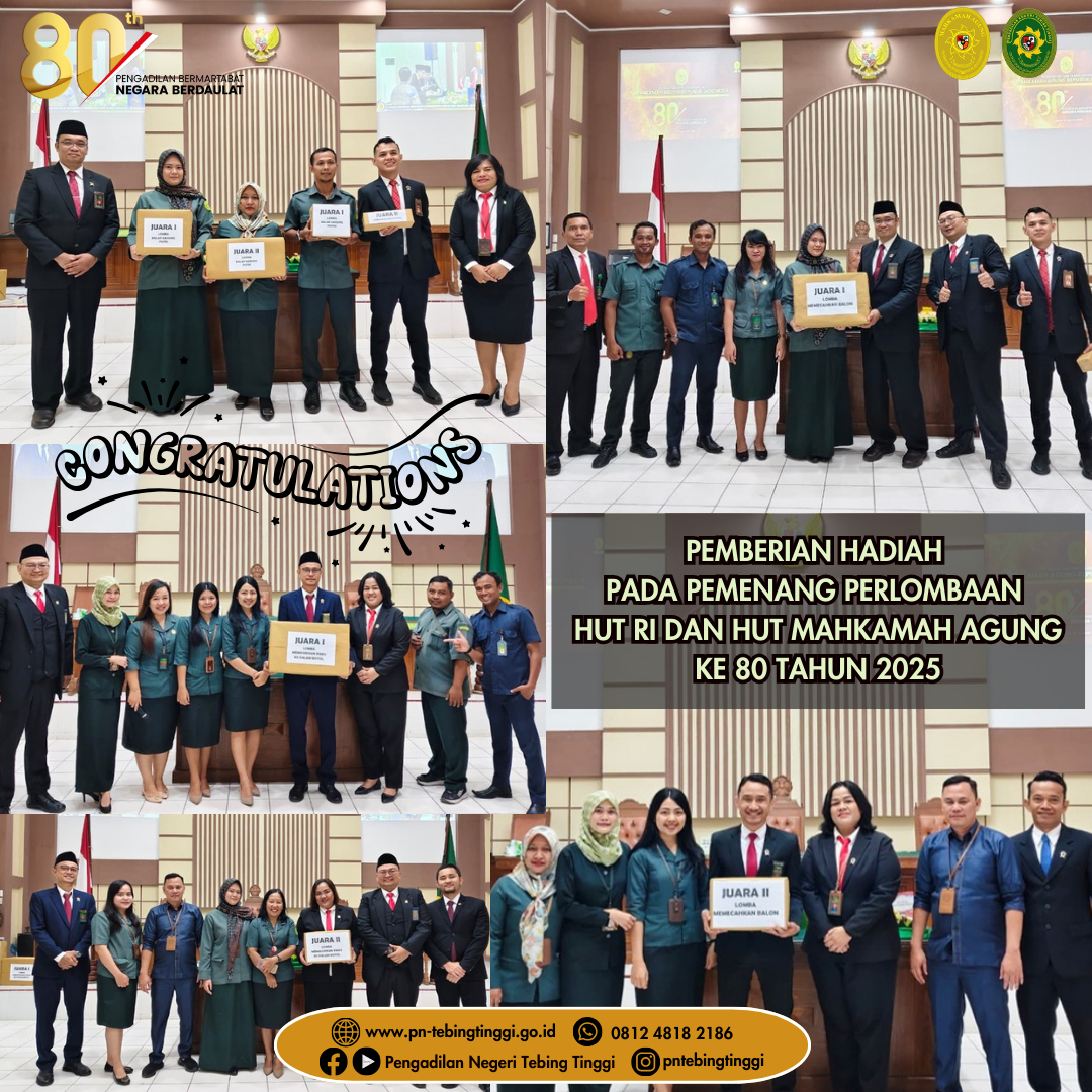 Selanjutnya, acara dilanjutkan dengan pemberian hadiah kepada para pemenang lomba dalam rangka memeriahkan HUT Kemerdekaan Republik Indonesia ke-80 dan HUT Mahkamah Agung RI ke-80. Perlombaan ini menjadi sarana mempererat kebersamaan, meningkatkan semangat sportivitas, dan membangun kekompakan antarpegawai.