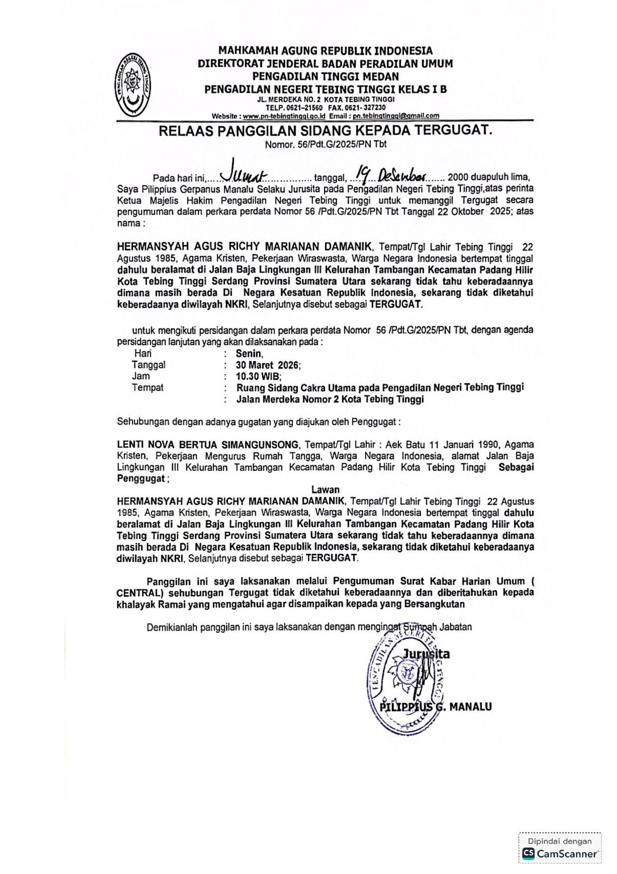 Relaas Panggilan Umum Perkara No 56/Pdt.G/2025/PN Tbt on Selasa, 27 Januari 2026. Posted in Panggilan Umum Tweet