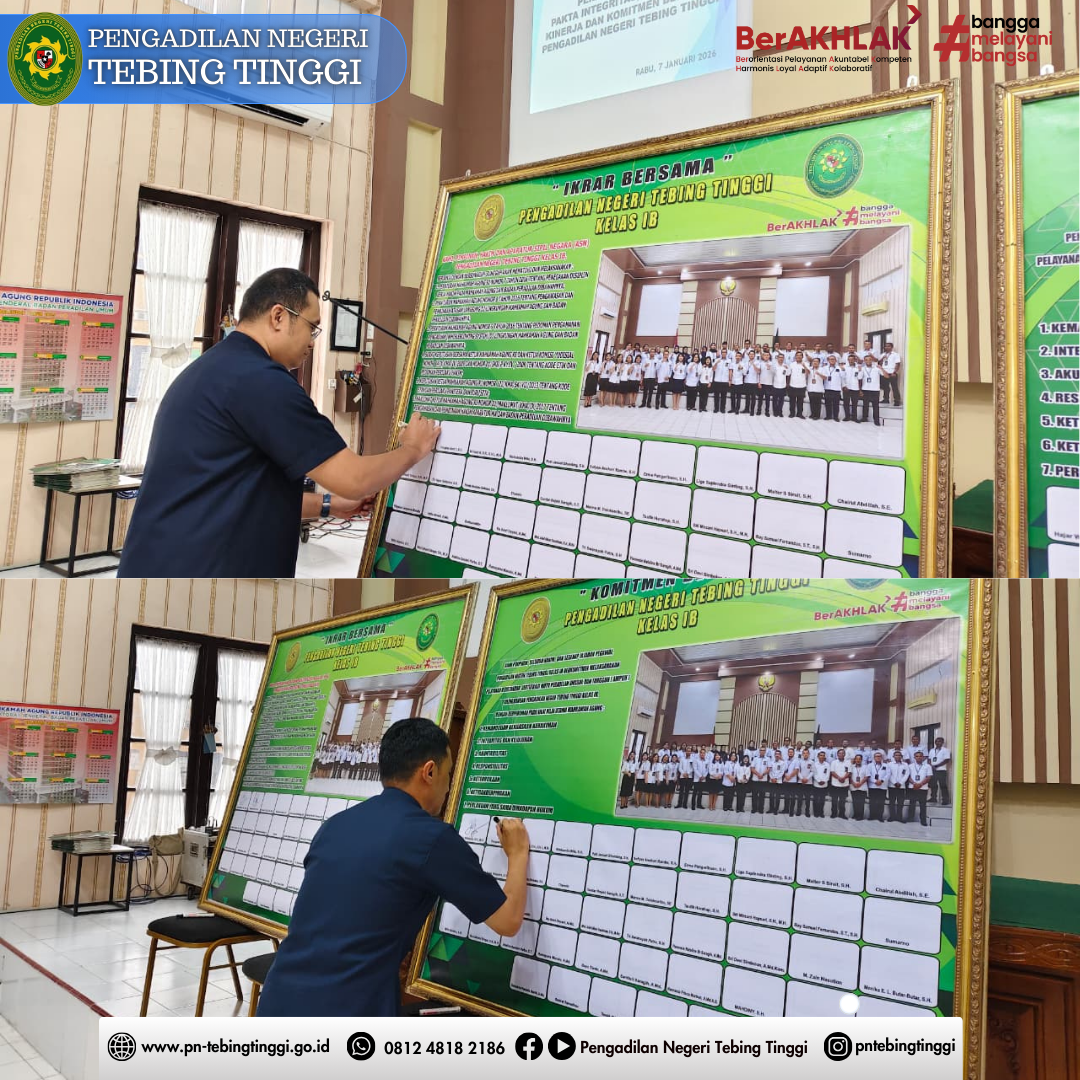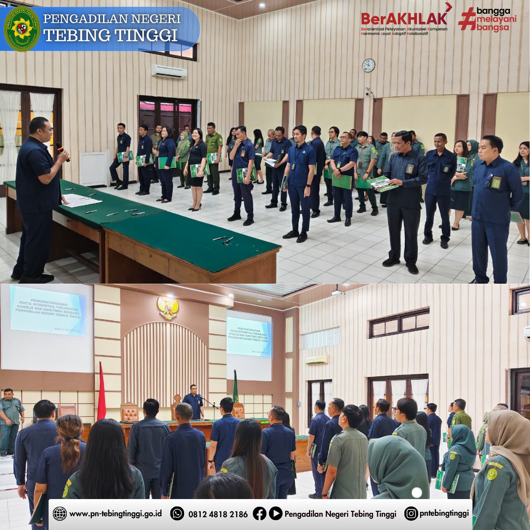 Pengadilan Negeri Tebing Tinggi melaksanakan Penandatanganan Pakta Integritas, Perjanjian Kinerja, dan Komitmen Bersama pada Rabu, 7 Januari 2026, bertempat di Ruang Sidang Cakra. Kegiatan ini dipimpin oleh Ketua Pengadilan Negeri Tebing Tinggi, Bapak Hajar Widianto, S.H., M.H., dan diikuti oleh seluruh aparatur Pengadilan Negeri Tebing Tinggi.