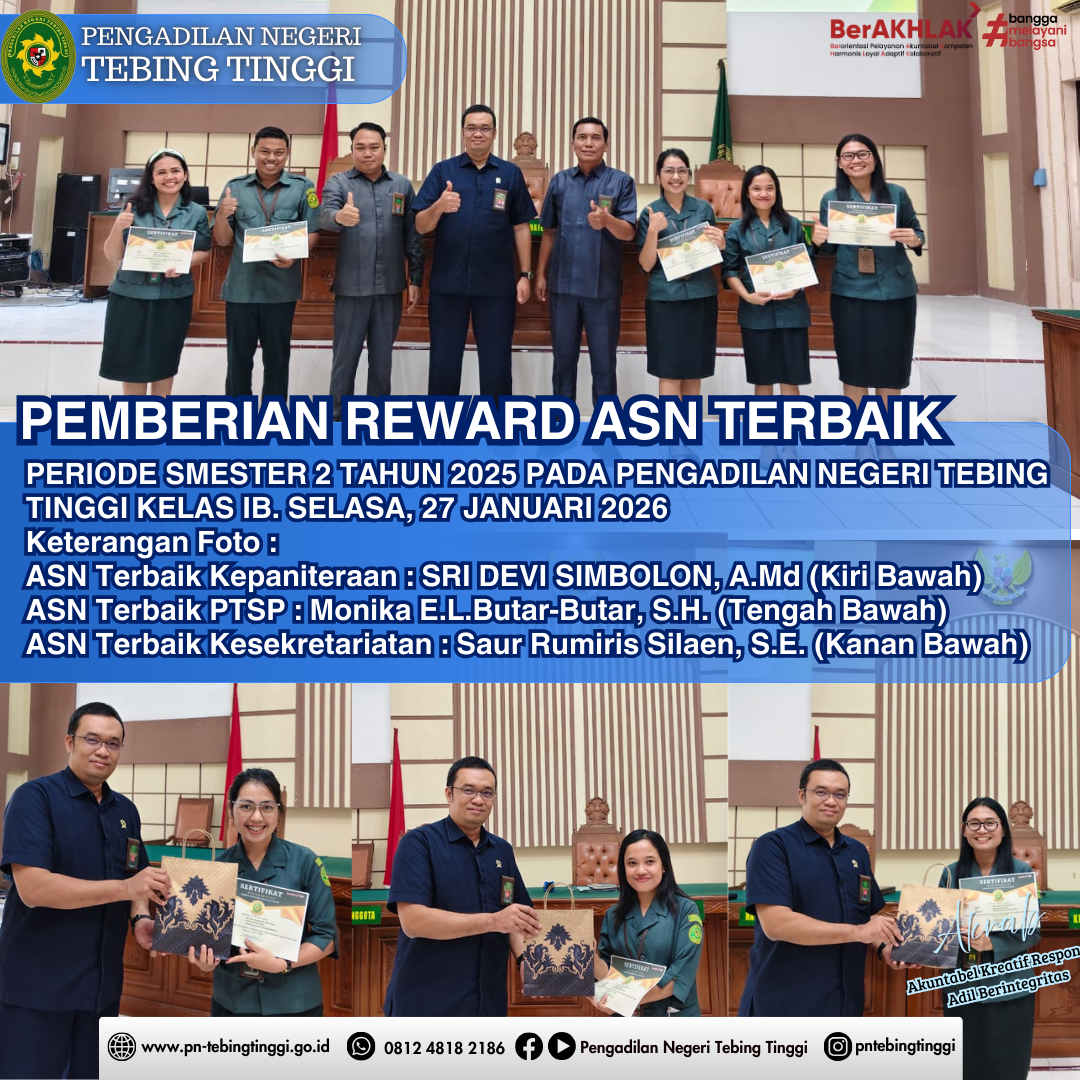 Selain itu, disampaikan pula pemberian penghargaan (reward) kepada ASN Terbaik sebagai bentuk apresiasi atas dedikasi dan kinerja yang telah ditunjukkan, dengan rincian sebagai berikut: