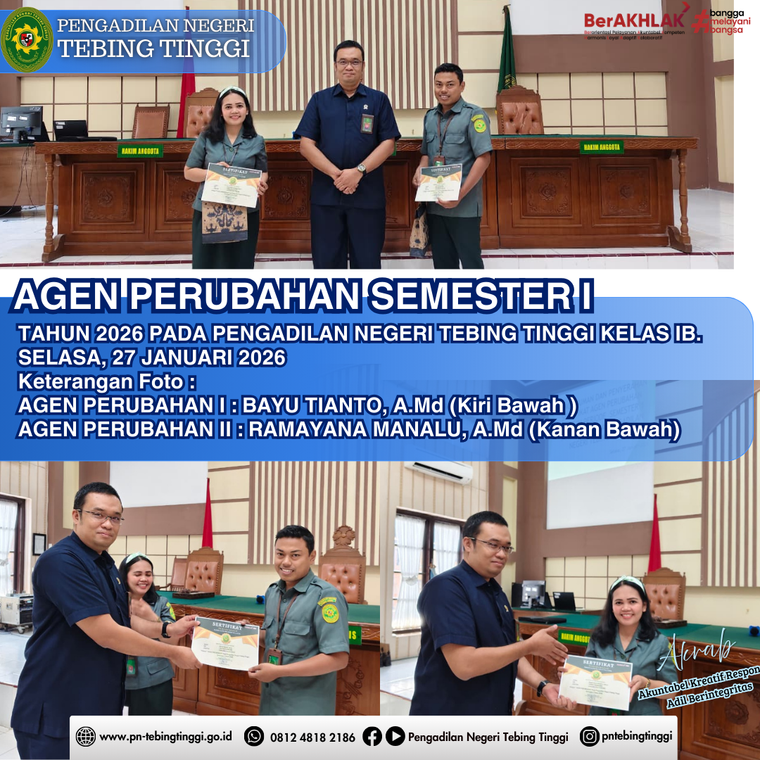 Pada akhir rapat, Ketua Pengadilan Negeri Tebing Tinggi mengumumkan Agen Perubahan Terpilih Semester I Tahun 2026, yaitu: